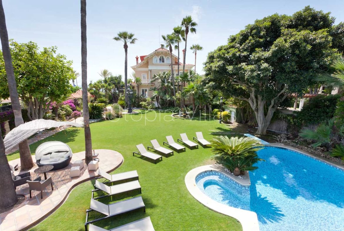 The completely redesigned gardens evoke a tropical paradise with lush foliage, mature trees, an elegant fountain, and a large swimming pool. The exterior spaces are completed with a generous chill-out area featuring barbecue facilities and alfresco dining—ideal for entertaining while enjoying the Mediterranean setting.